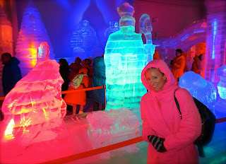 We had a great time looking at all the ice sculptures and especially enjoyed feeling cold for a few moments, seeing our breath in the air, and bundling up in our matching warm pink coats.
